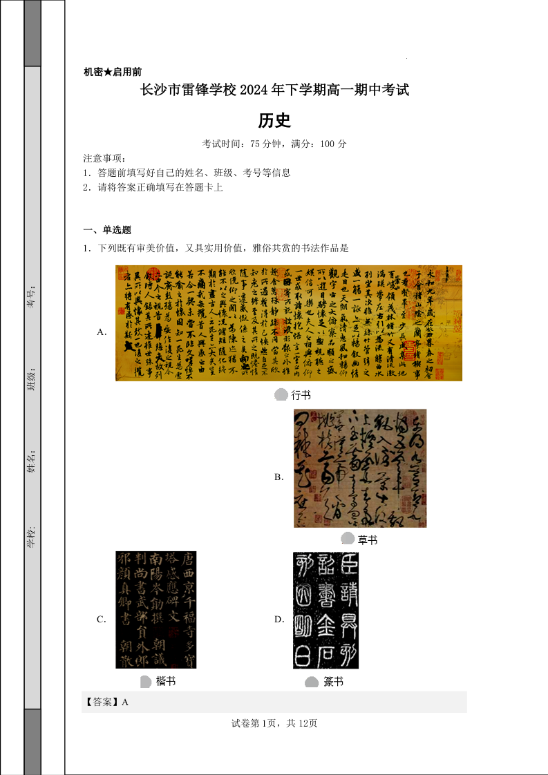 长沙市雷锋学校2024-2025学年高一上学期12月期中考试 历史答案