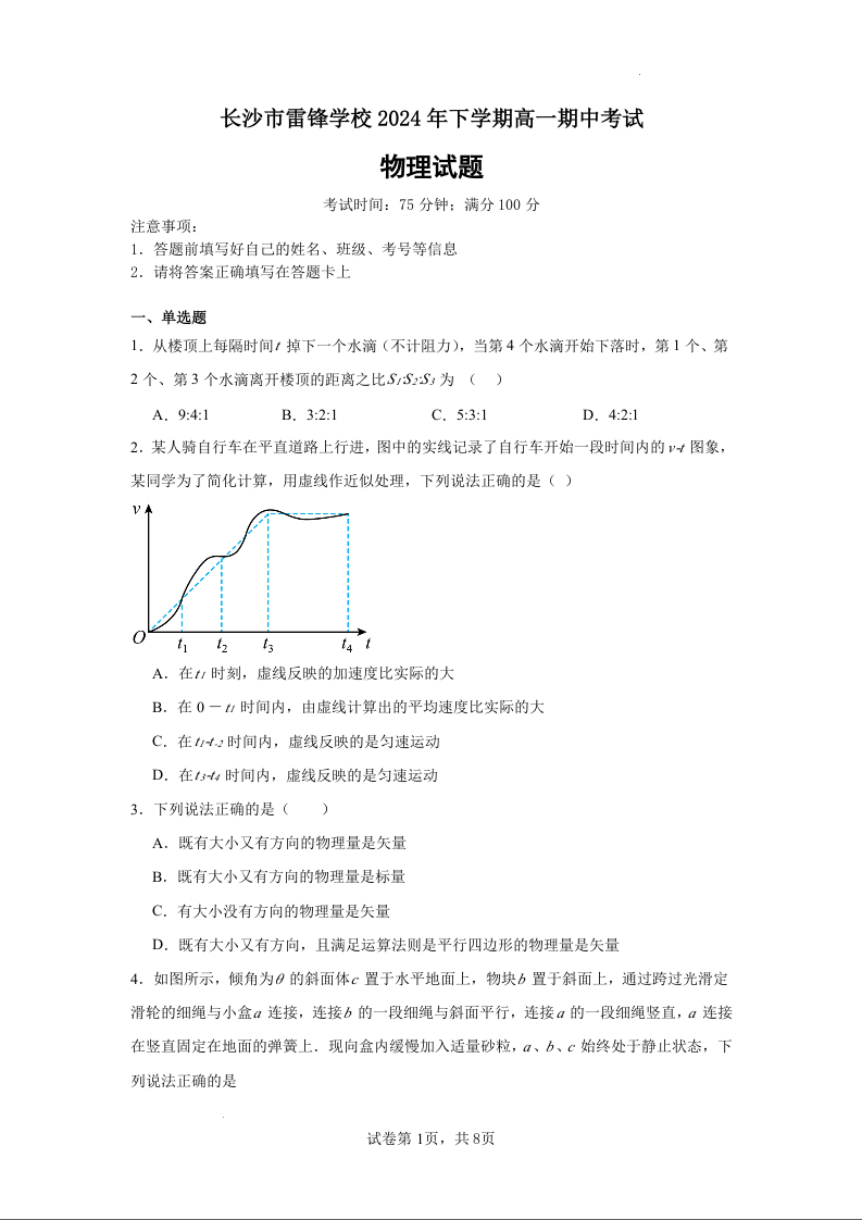 长沙市雷锋学校2024-2025学年高一上学期12月期中考试 物理