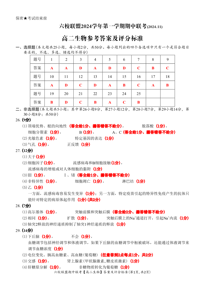 浙江省六校联盟2024-2025学年高二上学期期中联考 生物 • 答案和评分标准