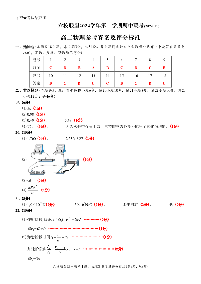 浙江省六校联盟2024-2025学年高二上学期期中联考 物理 • 答案和评分标准