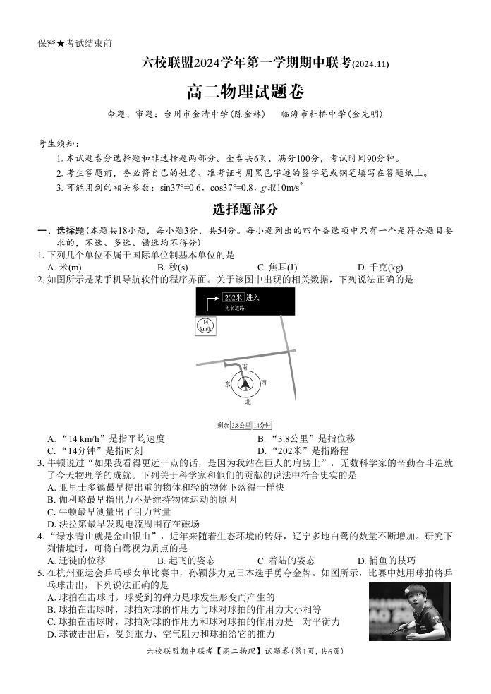 浙江省六校联盟2024-2025学年高二上学期期中联考 物理