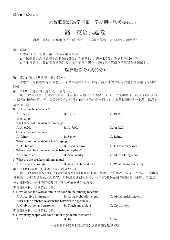 浙江省六校联盟2024-2025学年高二上学期期中联考 英语