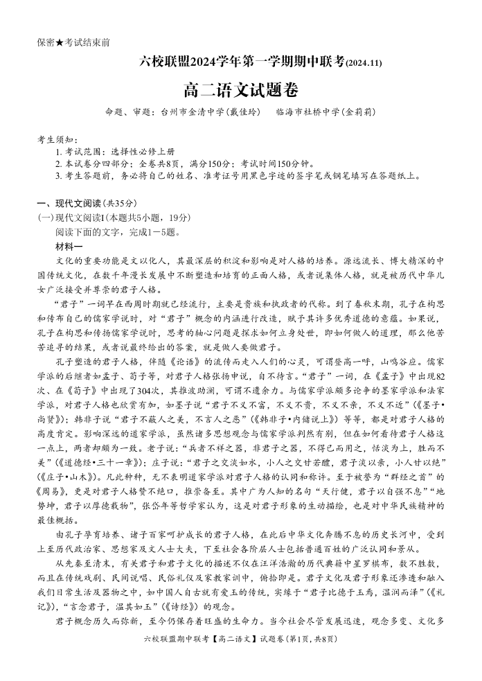 浙江省六校联盟2024-2025学年高二上学期期中联考 语文