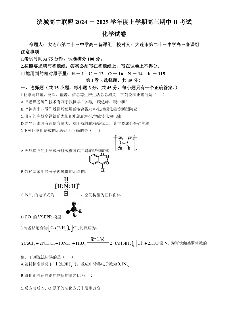 辽宁省大连市滨城高中联盟2025届高三上学期期中ll考试 化学