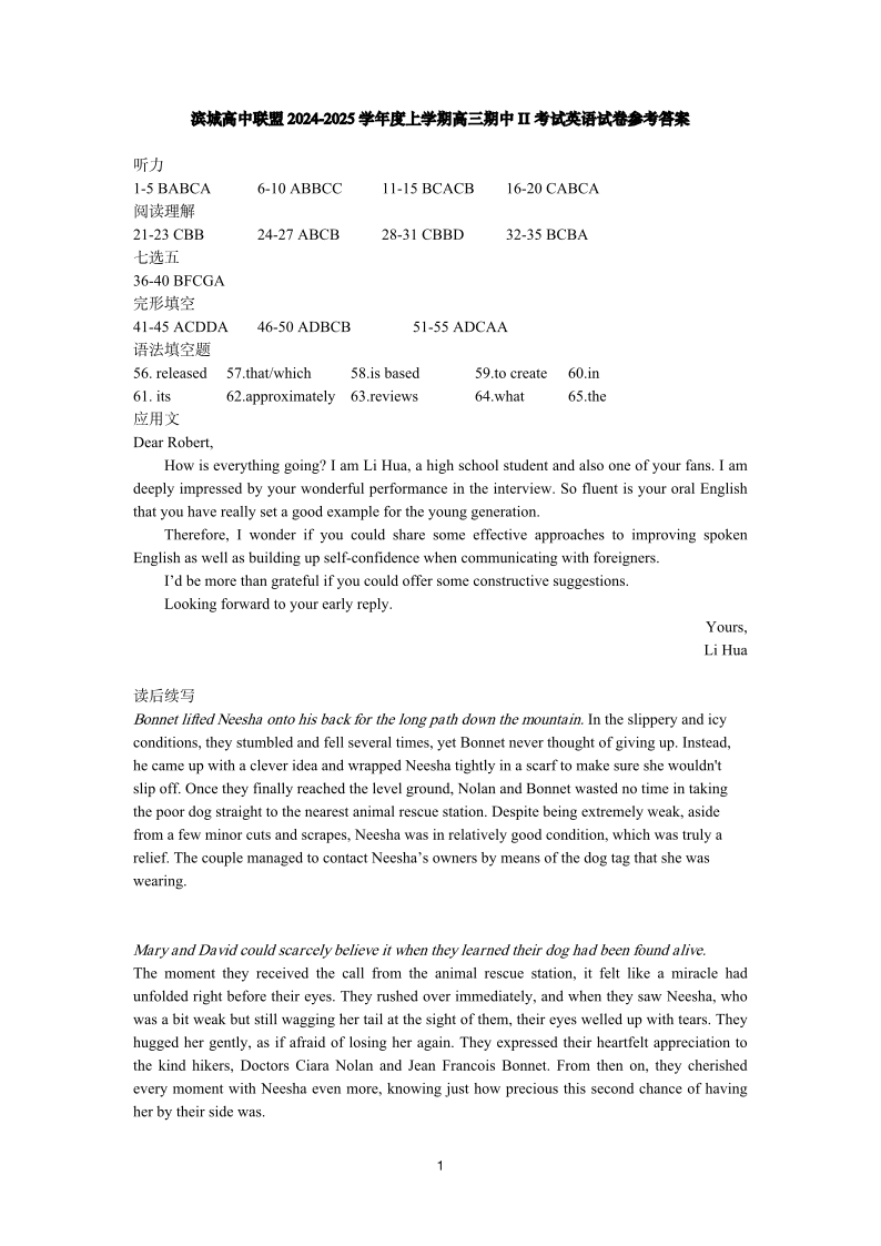 辽宁省大连市滨城高中联盟2025届高三上学期期中ll考试 英语答案