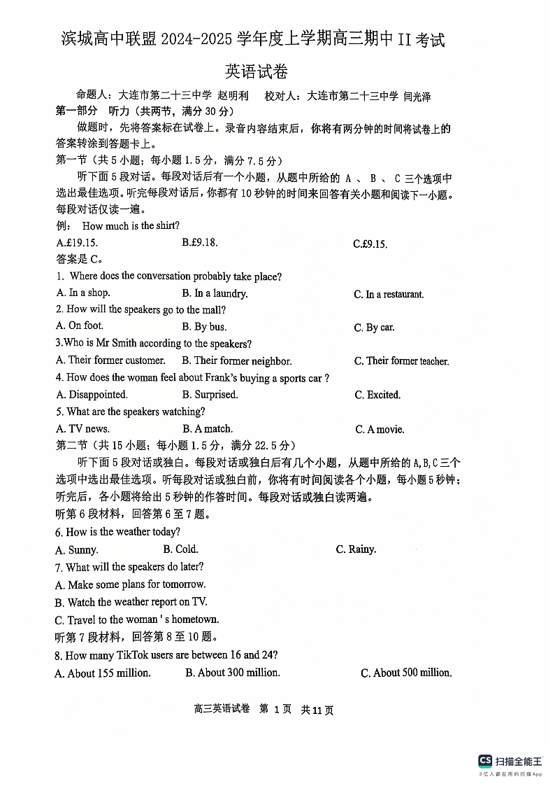 辽宁省大连市滨城高中联盟2025届高三上学期期中ll考试 英语