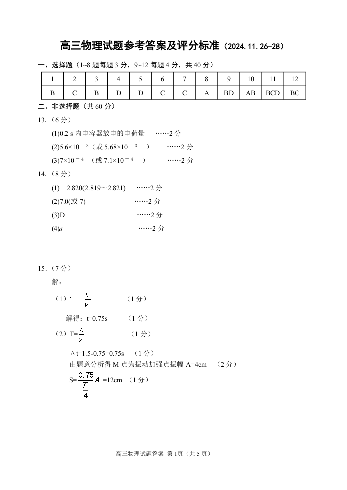 山东省威海市文登区2024-2025学年高三上学期第一次模拟考试 物理答案