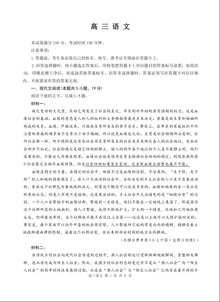 山东省威海市文登区2024-2025学年高三上学期第一次模拟考试 语文