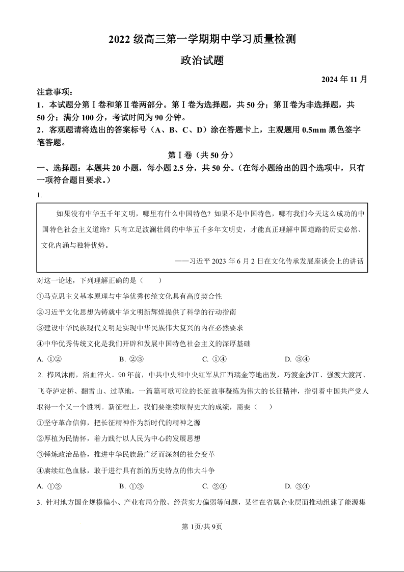 临淄中学2025届高三第一学期期中学习质量检测 政治