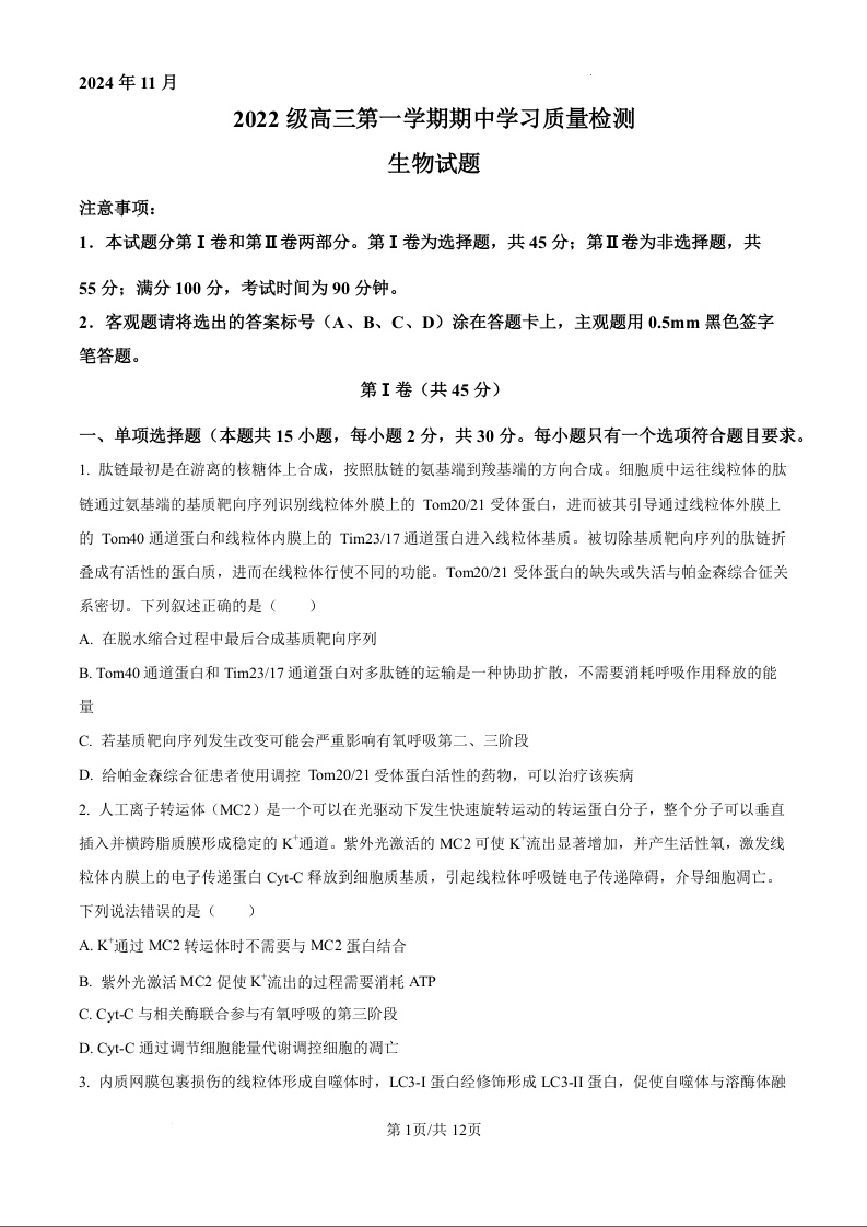 临淄中学2025届高三第一学期期中学习质量检测 生物