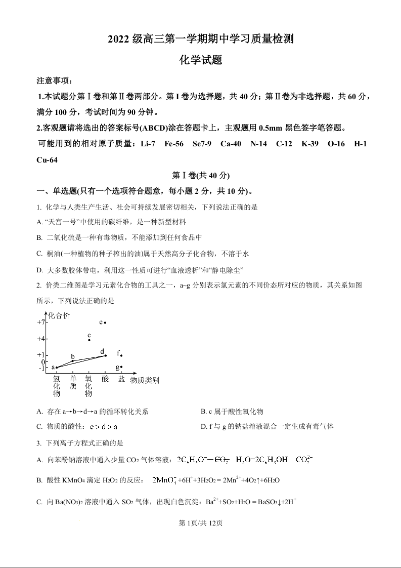 临淄中学2025届高三第一学期期中学习质量检测 化学