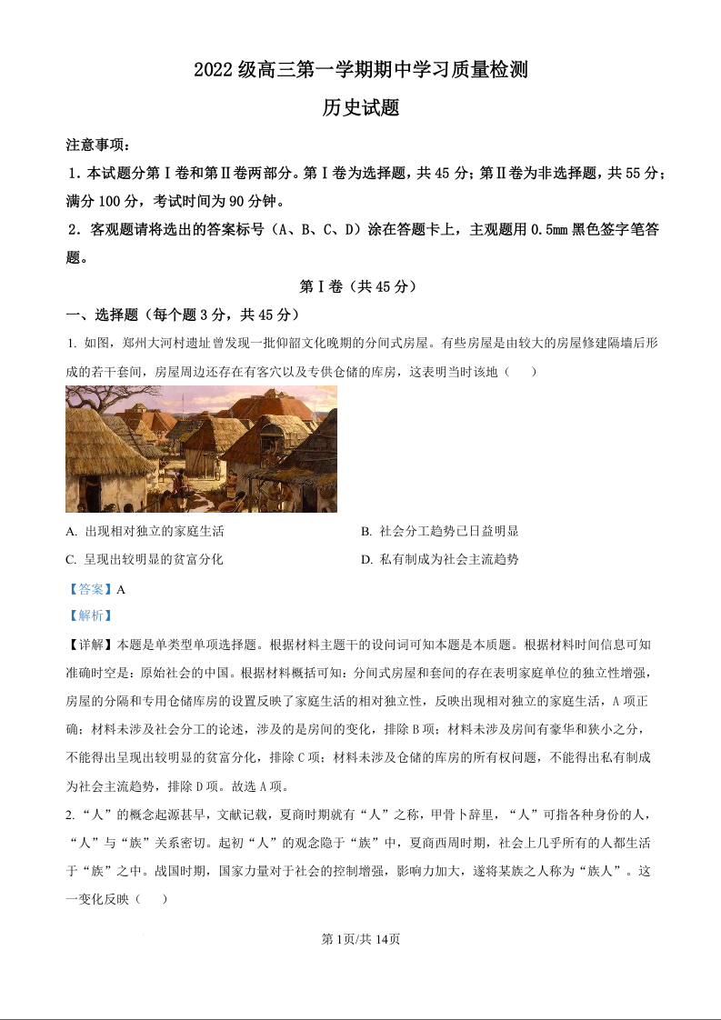 临淄中学2025届高三第一学期期中学习质量检测 历史答案