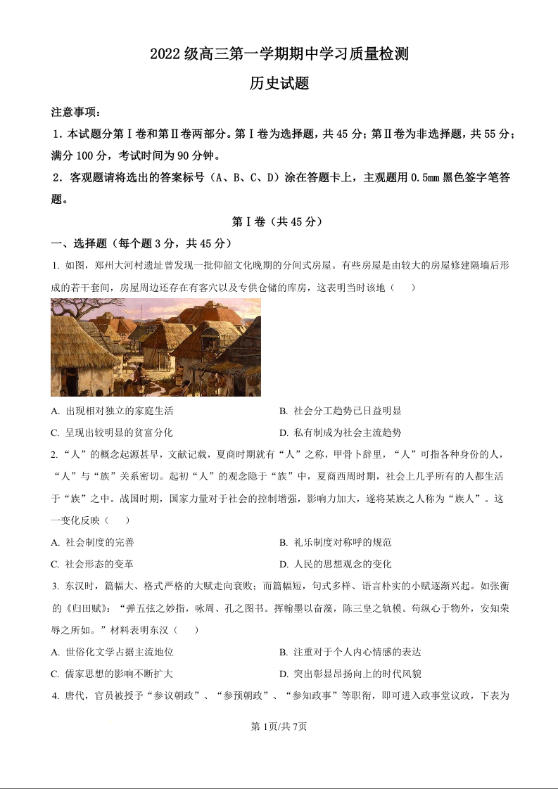 临淄中学2025届高三第一学期期中学习质量检测 历史