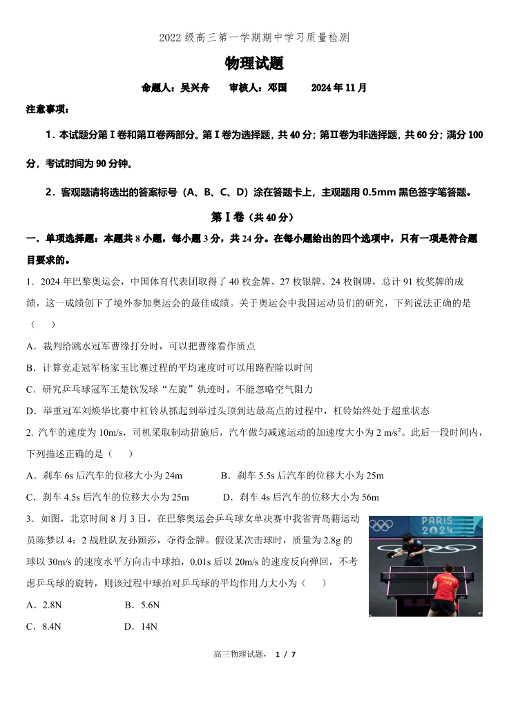 临淄中学2025届高三第一学期期中学习质量检测 物理