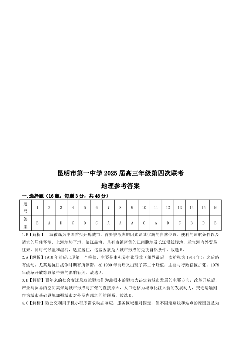 云南省昆明市第一中学2025届高三年级第四次联考 地理答案