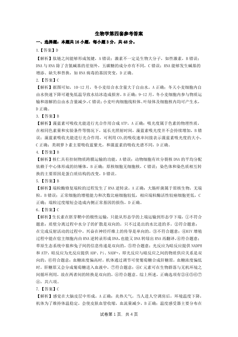 云南省昆明市第一中学2025届高三年级第四次联考 生物答案
