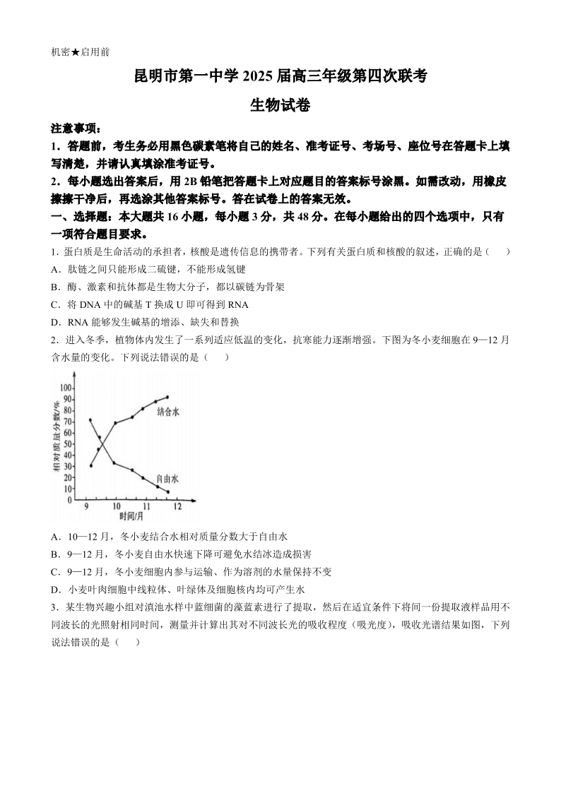 云南省昆明市第一中学2025届高三年级第四次联考 生物