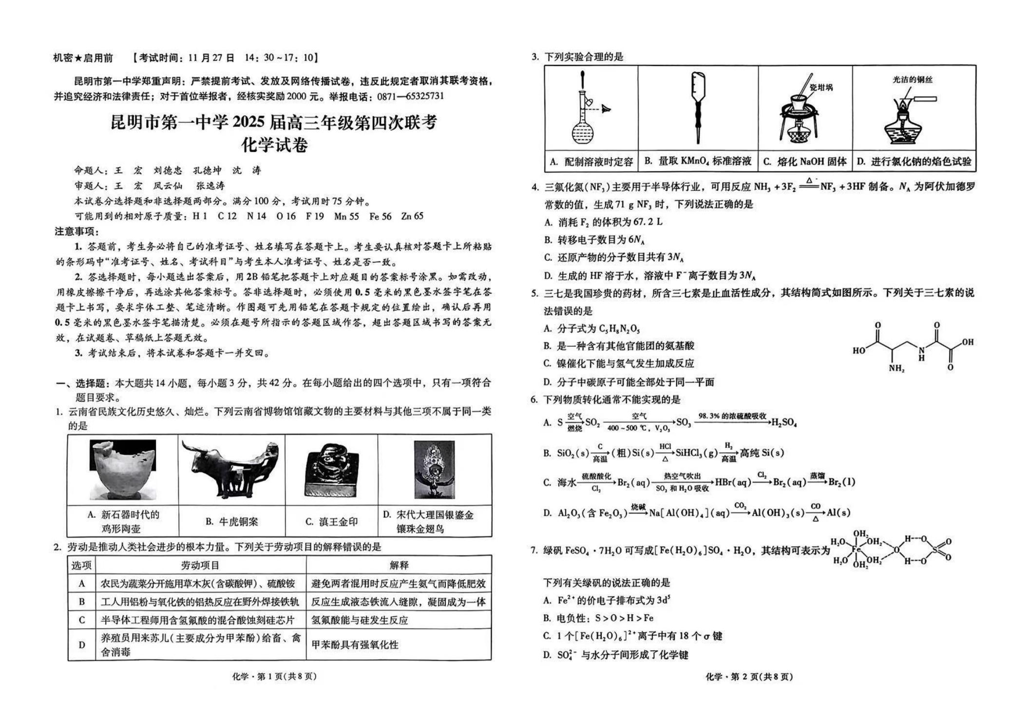 云南省昆明市第一中学2025届高三年级第四次联考 化学答案