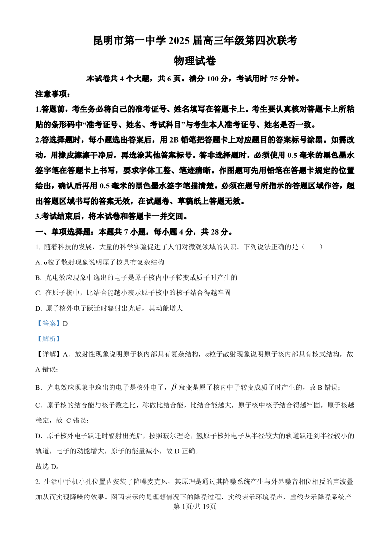 云南省昆明市第一中学2025届高三年级第四次联考 物理答案