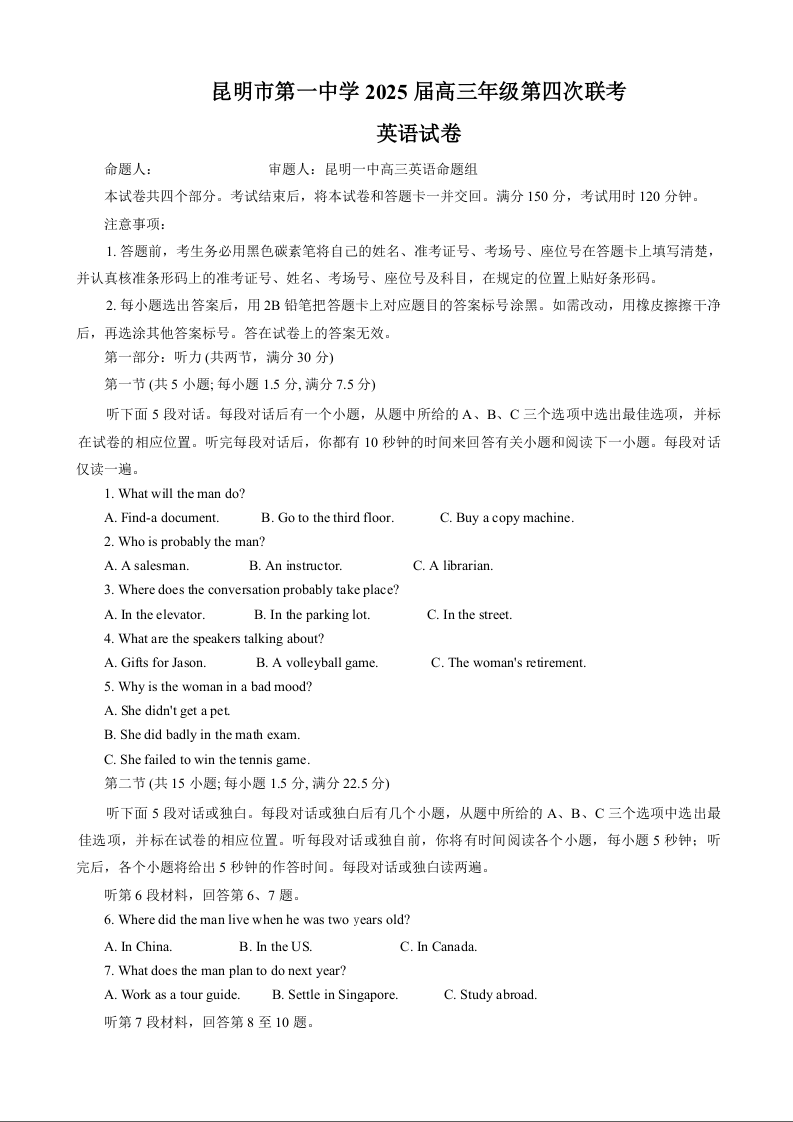 云南省昆明市第一中学2025届高三年级第四次联考 英语