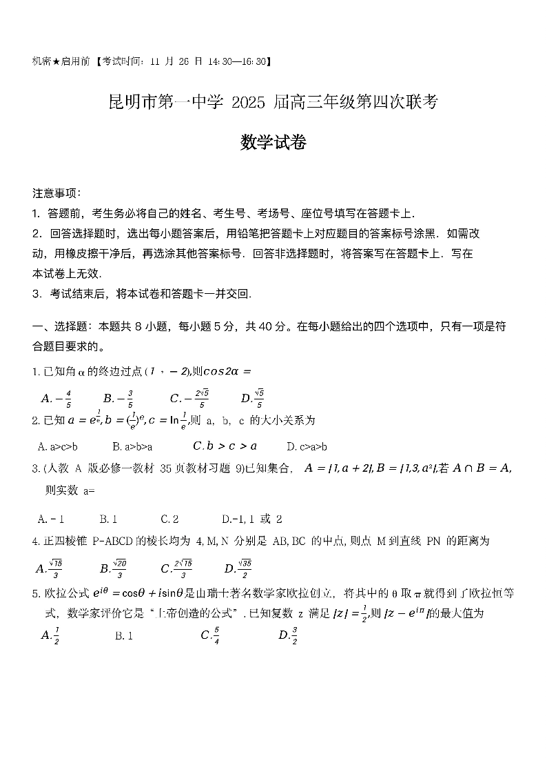 云南省昆明市第一中学2025届高三年级第四次联考 数学