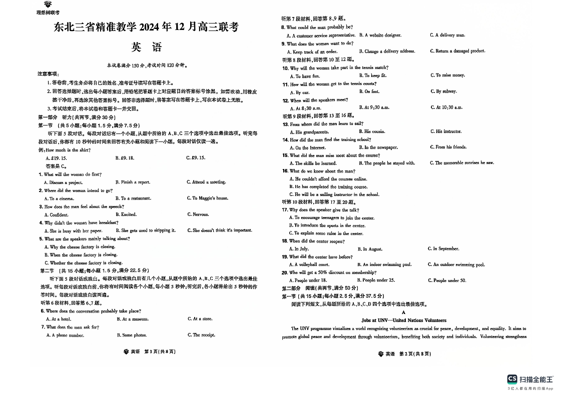 东北三省精准教学2024年12月高三联考 英语