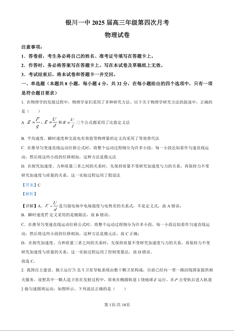 宁夏银川一中2025届高三上学期第四次月考 物理答案