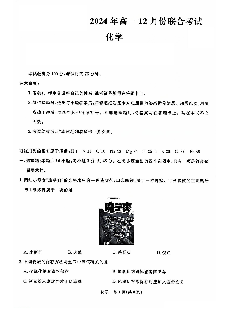 辽宁省名校联盟2024年高一12月份联合考试 化学