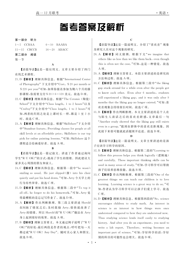 辽宁省名校联盟2024年高一12月份联合考试 英语答案