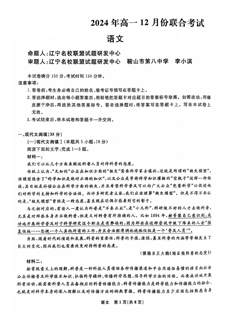辽宁省名校联盟2024年高一12月份联合考试 语文