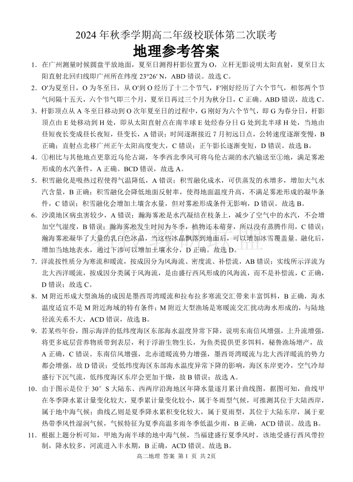 广西河池市2024年秋季学期高二年级校联体第二次联考 地理答案