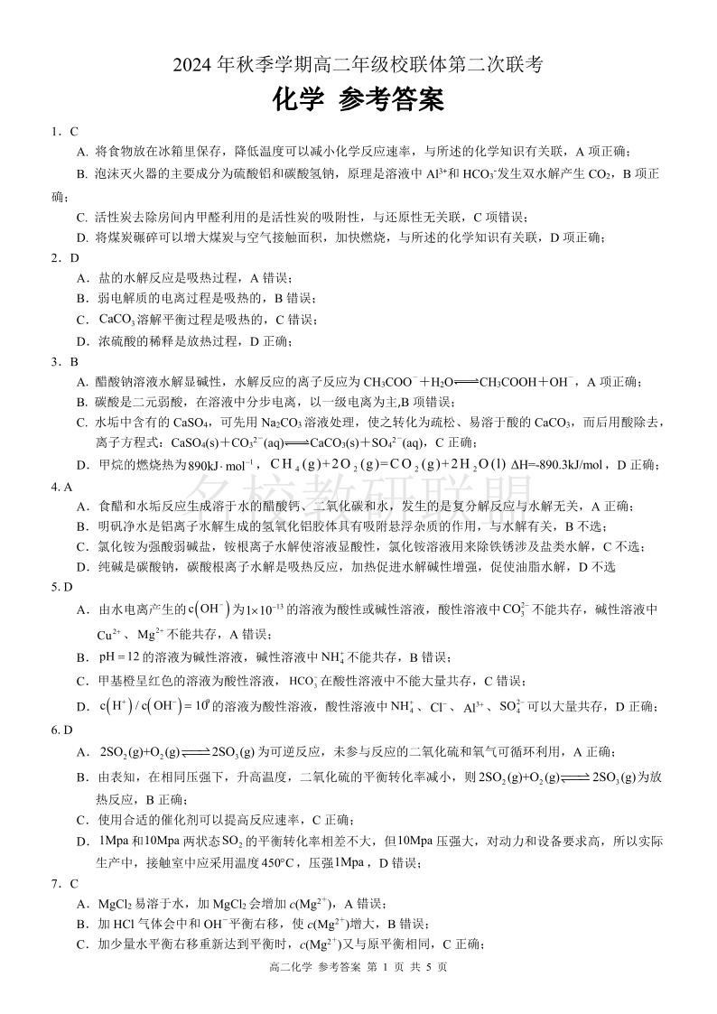 广西河池市2024年秋季学期高二年级校联体第二次联考 化学答案