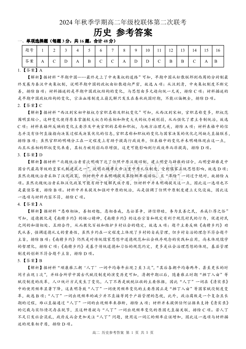 广西河池市2024年秋季学期高二年级校联体第二次联考 历史答案