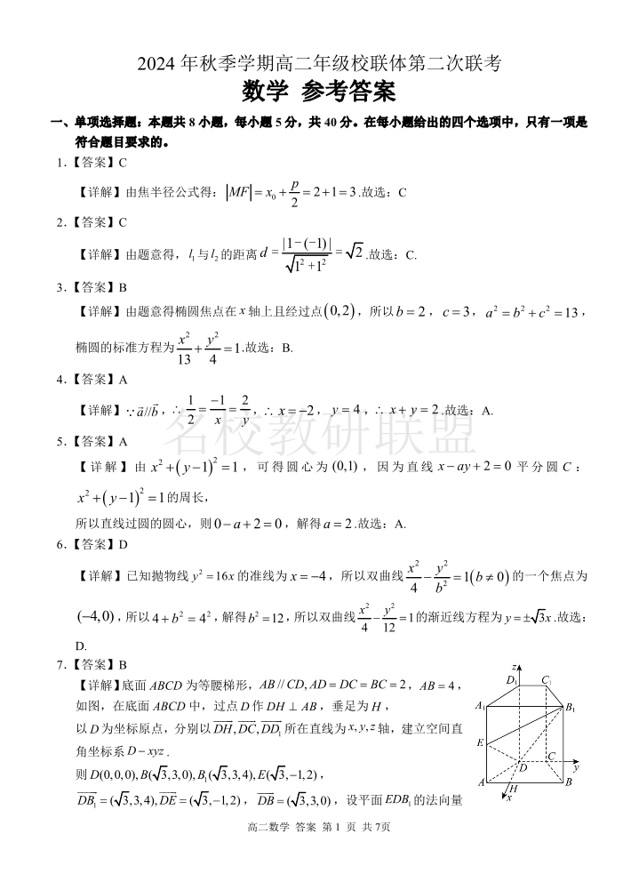 广西河池市2024年秋季学期高二年级校联体第二次联考 数学答案