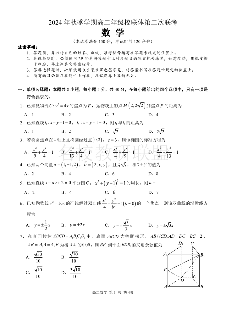 广西河池市2024年秋季学期高二年级校联体第二次联考 数学