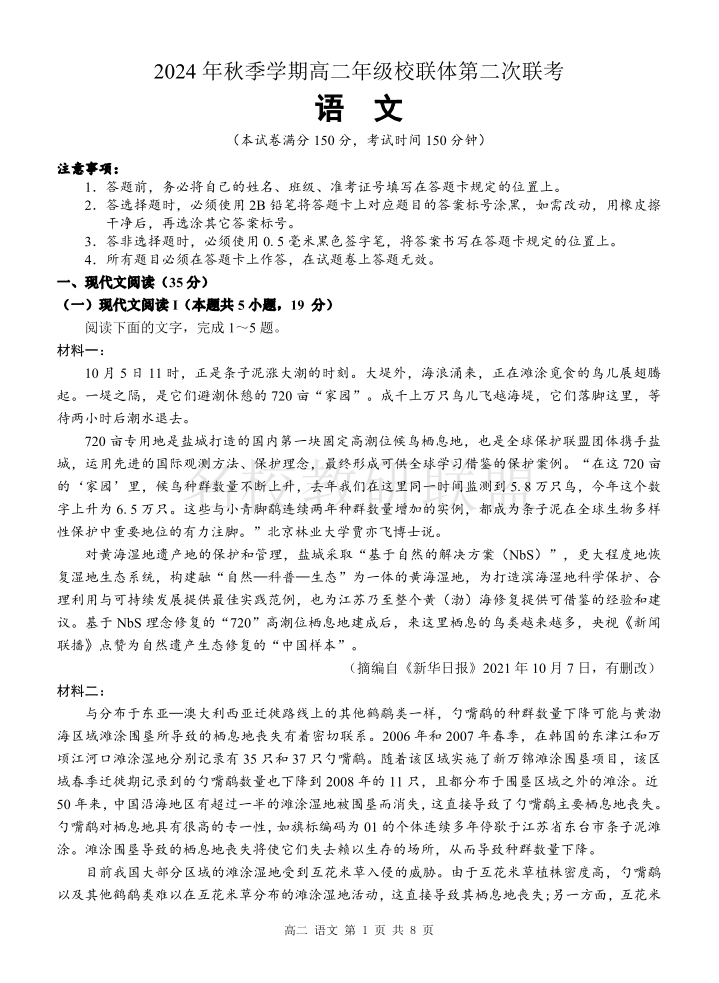 广西河池市2024年秋季学期高二年级校联体第二次联考 语文