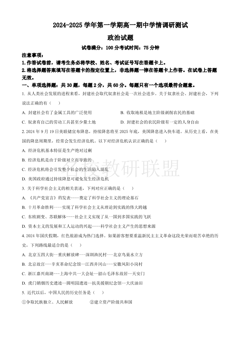 江苏省扬州市高邮市2024-2025学年高一上学期11月期中考试 政治