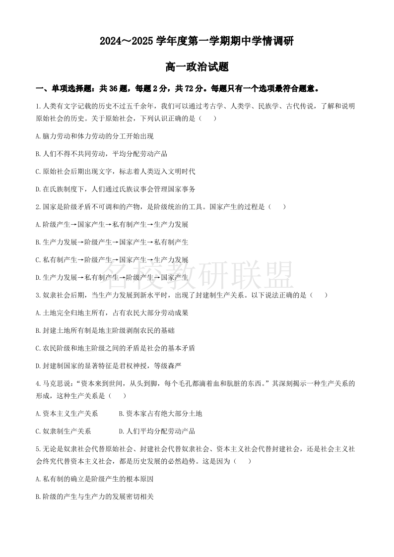 江苏省徐州市铜山区2024-2025学年度高一第一学期期中学情调研 政治