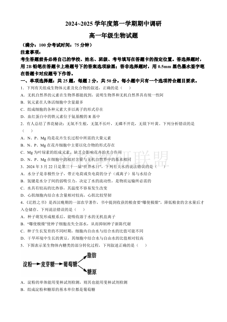 江苏省徐州市铜山区2024-2025学年度高一第一学期期中学情调研 生物