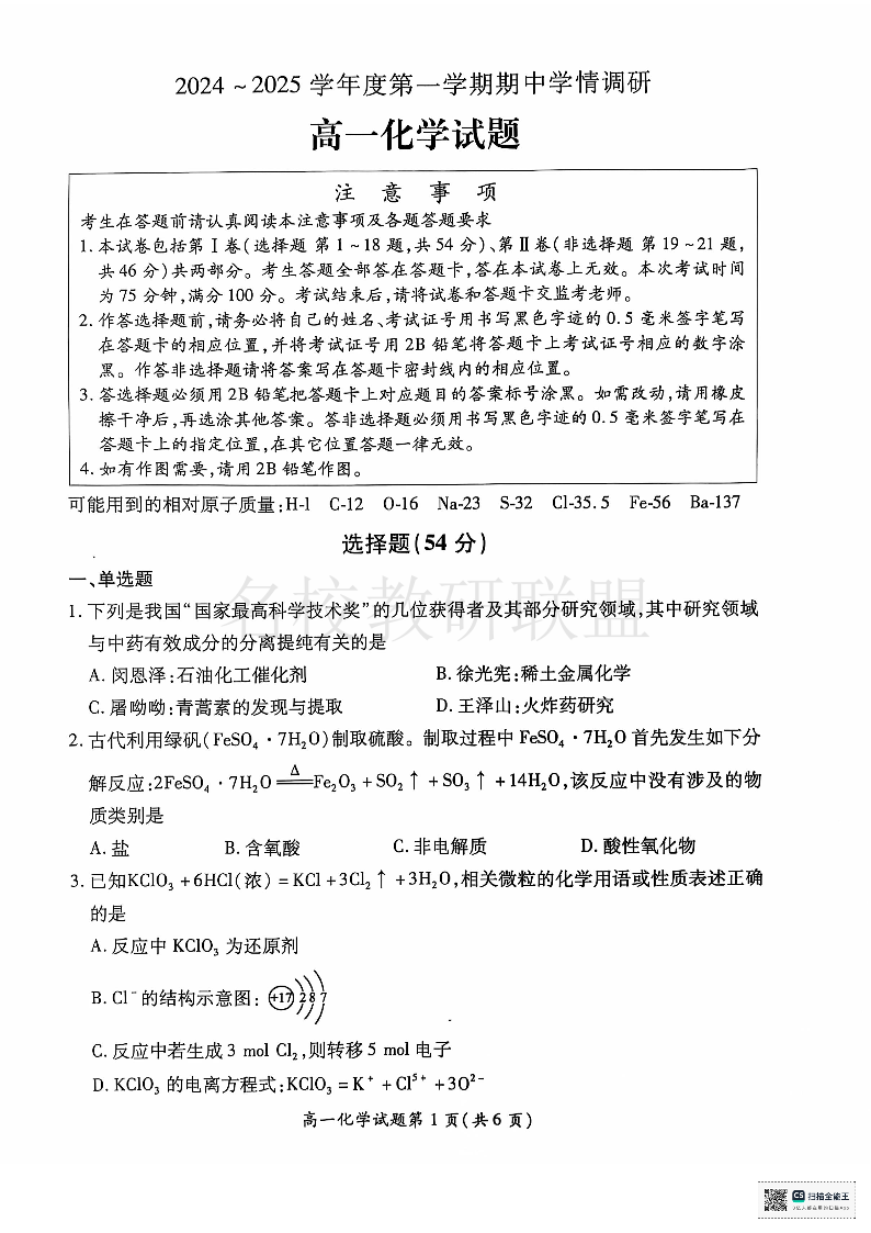 江苏省徐州市铜山区2024-2025学年度高一第一学期期中学情调研 化学