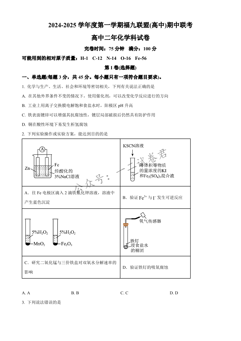 福建省福州九校2024-2025学年高二上学期11月期中联考 化学