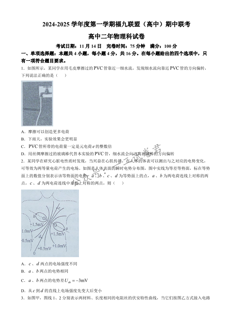 福建省福州九校2024-2025学年高二上学期11月期中联考 物理
