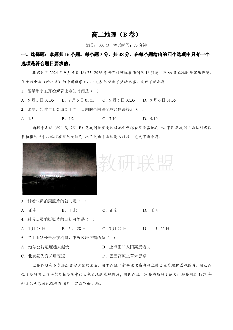 安徽省黄山市八校联考2024-2025学年高二上学期11月期中考试 地理