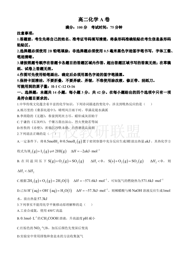 安徽省黄山市八校联考2024-2025学年高二上学期11月期中考试 化学