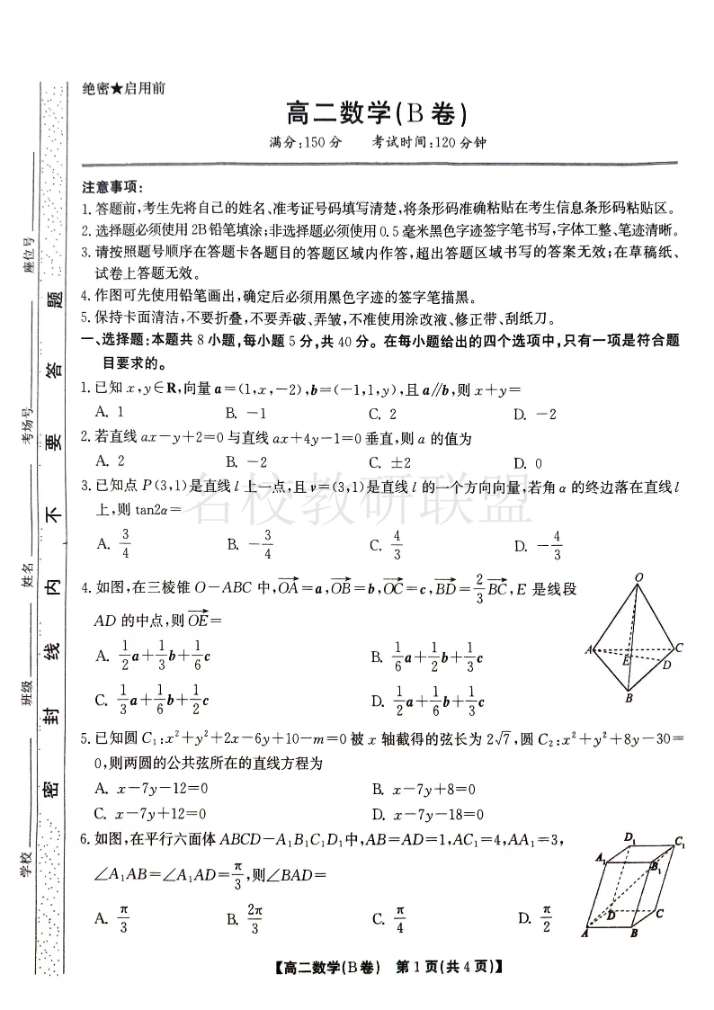 安徽省黄山市八校联考2024-2025学年高二上学期11月期中考试 数学