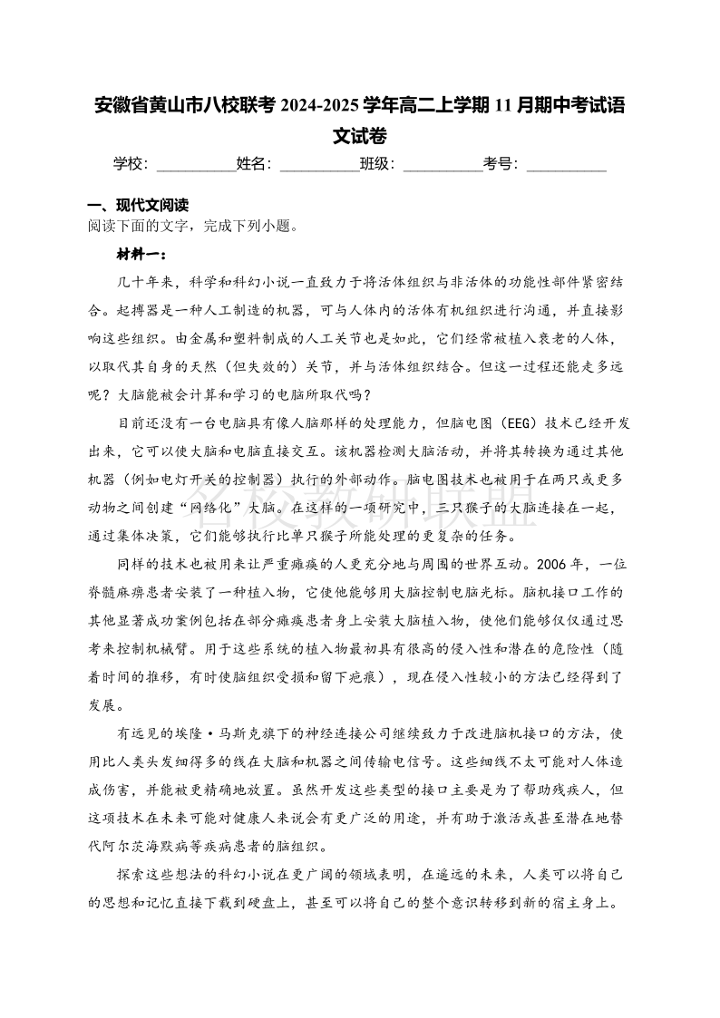 安徽省黄山市八校联考2024-2025学年高二上学期11月期中考试 语文