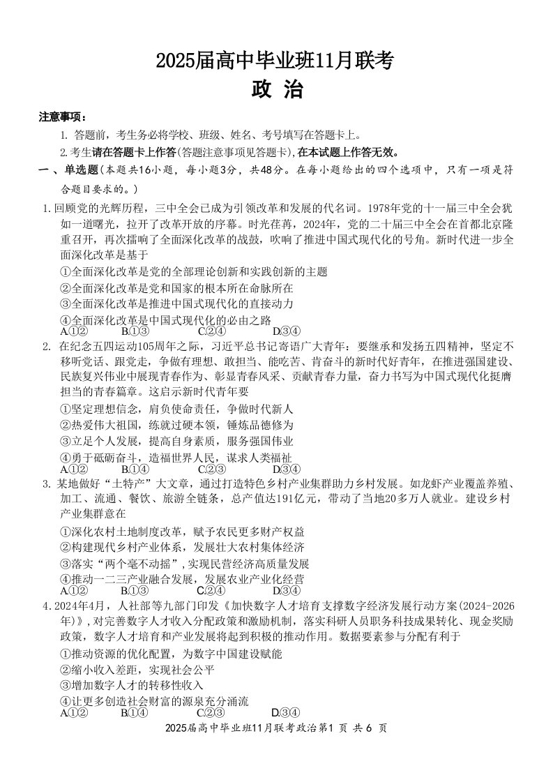 广西新课程教研联盟2025届高三毕业班11月联考 政治