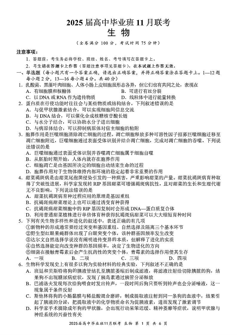 广西新课程教研联盟2025届高三毕业班11月联考 生物