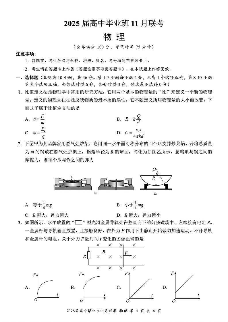 广西新课程教研联盟2025届高三毕业班11月联考 物理