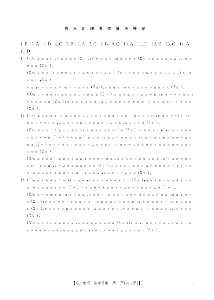 湖北省部分学校2024-2025学年高三上学期12月联考 地理答案